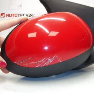 Desno crveno vanjsko ogledalo za Citroën C1 i Peugeot 107, idealno za stranu suvozača. Ogledalo je lagano ogrebano kao što je prikazano na fotografiji, no zadržava izvrsnu funkcionalnost i estetski izgled. Ovo ogledalo je savršen izbor za mehaničare i osobe koje same popravljaju vozila, jer omogućava brzu i jednostavnu zamjenu oštećenih ili istrošenih originalnih dijelova.